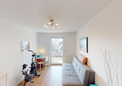 Die Wohnung im 5. Obergeschoss bietet 112 m² Wohnfläche und eignet sich für Paare, Familien und Personen, die barrierefreies und stadtzentriertes Wohnen bevorzugen. Die erhöhte Lage ermöglicht einen weitreichenden Blick über Stuttgart bis in die umliegenden Höhenzüge, sichtbar aus Wohnbereich, Schlafzimmern und vom Südbalkon.