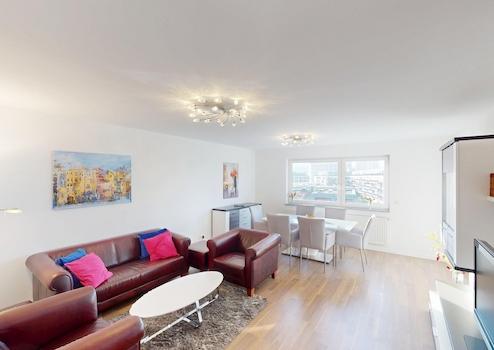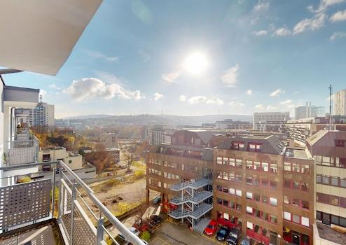 Die Wohnung im 5. Obergeschoss (oberste Etage) bietet 112 m² Wohnfläche und eignet sich für Paare, Familien und Personen, die barrierefreies und stadtzentriertes Wohnen bevorzugen. Die erhöhte Lage ermöglicht einen weitreichenden Blick über Stuttgart bis in die umliegenden Höhenzüge, sichtbar aus Wohnbereich, Schlafzimmern und vom Südbalkon.