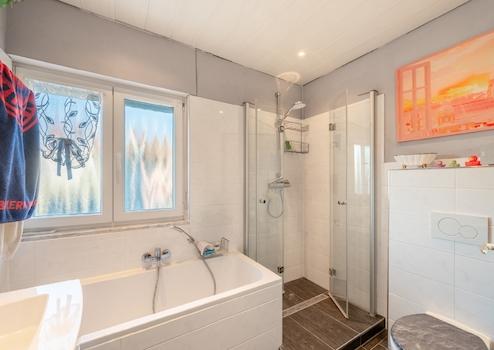 Über eine Steintreppe gelangen Sie in das Obergeschoss. Hier finden Sie zur linken Seite einen kompakten Raum, der ideal als Gästezimmer genutzt werden kann. Das Elternschlafzimmer nebenan ist mit einem Teppichboden versehen und bietet Zugang zum Südbalkon. Das Kinderzimmer, mit Parkettboden versehen, hat ein Fenster in westlicher Ausrichtung. Das Badezimmer am Ende des Flurs ist mit einer Badewanne, Dusche, WC und Waschbecken ausgestattet.