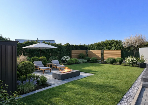 Sonnige Terrasse mit Garten und Gartenhaus