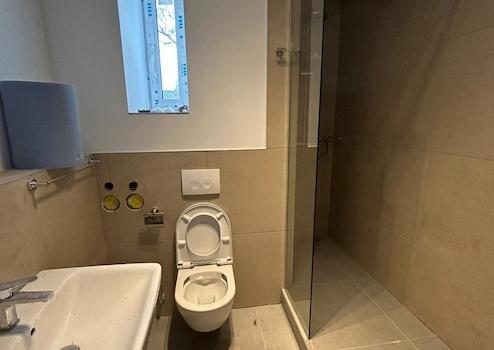 Das exklusive Badezimmer ist mit hochwertiger Geberit-Keramik, einer großzügigen Regendusche und einem eleganten Design ausgestattet. Großformatige 60 × 60 cm Sandsteinfliesen unterstreichen das edle Gesamtbild.