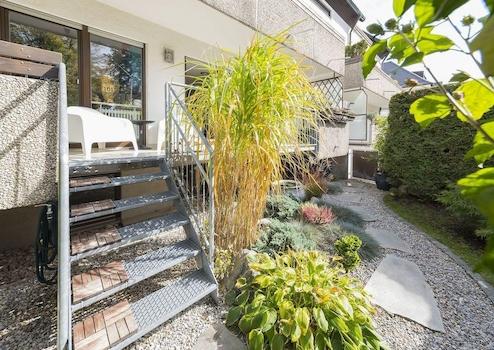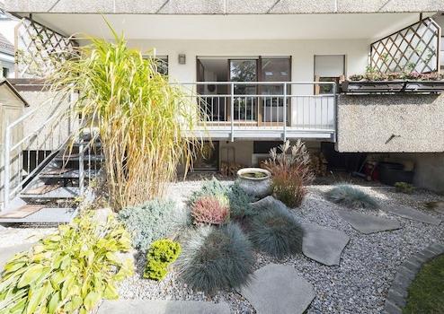 Der liebevoll angelegte eigene kleine Garten ist über die östliche Terrasse erreichbar; über die westliche Terrasse gelangt man in den gemeinschaftlich genutzten Gartenbereich.