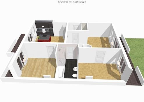 Die Wohnung wird unmöbliert vermietet. Abgebildete Möbel dienen ausschließlich als Einrichtungsbeispiele. 3D-Visualisierungen sind illustrative Darstellungen und können von der tatsächlichen Wohnung abweichen.