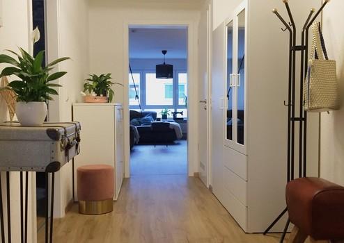 Die Wohnung wurde vollständig neu gestrichen; Innentüren und Zargen sind weiß lackiert, was für ein helles, einheitliches Erscheinungsbild sorgt.