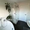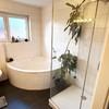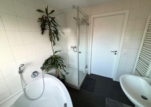 Das Badezimmer verfügt über eine moderne Dusche mit rundum verglaster Abtrennung im Format ca. 90 × 90 cm, die zeitgemäßen Komfort bietet. Die offene Küche ist harmonisch in den Wohnbereich integriert und unterstützt das großzügige Raumgefühl.