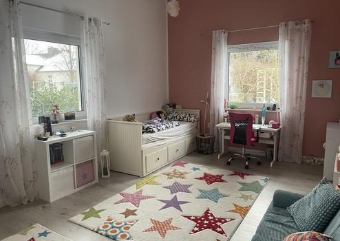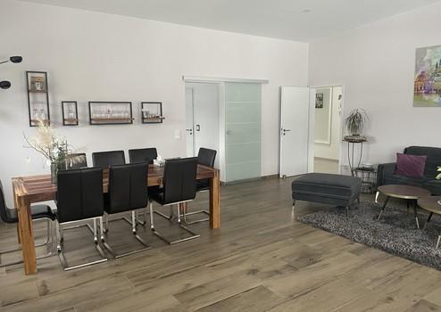 Auf ca. 150 m² Wohnfläche verteilen sich vier Zimmer, ergänzt durch einen praktischen Abstellraum sowie einen separaten Hauswirtschaftsraum (HWR) – alles ebenerdig. Hohe Decken, große Fensterflächen sowie zusätzliche Lichtkuppeln sorgen für helle, freundliche und lichtdurchflutete Räume mit einem außergewöhnlich großzügigen Raumgefühl. Bis auf das Kinderzimmer sind sämtliche Wohnräume gefliest und somit besonders pflegeleicht.