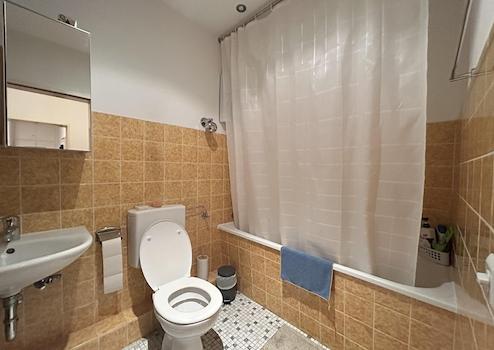 Das kompakte Bad bietet alles was benötigt wird, eine Duschwanne, eine Toilette, Waschbecken und eine Handtuchheizung. Das Bad wird vor Einzug noch renoviert.