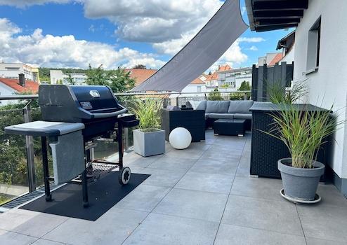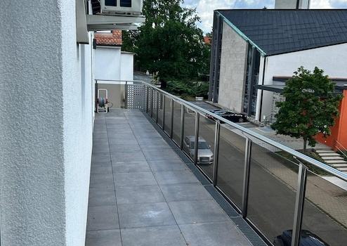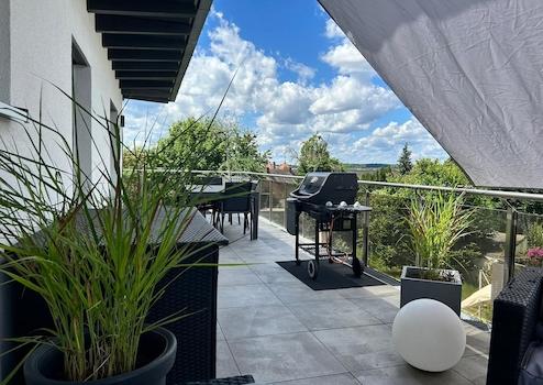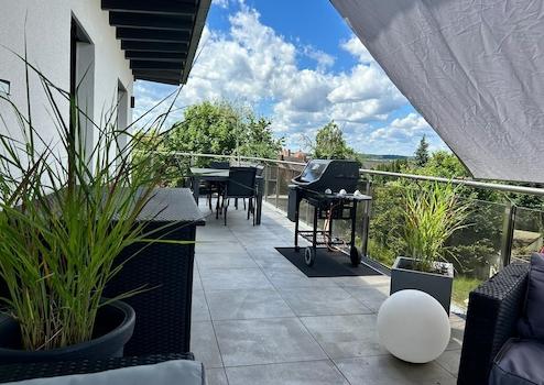 Bei dieser einzigartigen, barrierefreien Immobilie handelt es sich um eine Penthouse-Wohnung mit 122m² im zweiten Stock mit großer Dachterrasse und einer bodentiefen Glasfront, die sich über die komplette Südseite zieht. Der Ausblick der Immobilie in Richtung Süd-West reicht weit über Zirndorf hinweg.