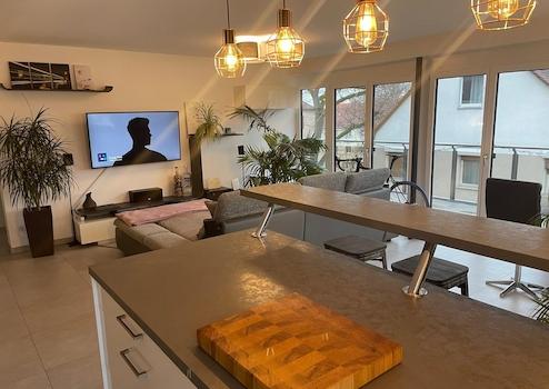 Der 36m² große Wohn-/Essbereich ist mit einer modernen Einbauküche und hochwertigen Geräten ausgestattet. Die Einbauküche bietet neben enormen Stauraum zusätzlich noch Platz für eine Bar mit Sitzhockern. Die hochwertigen, hellen Fliesen, sowie die bodentiefe Glasfront der Südseite lassen den Raum in Helligkeit strahlen. Sowohl Schlaf- als auch Kinderzimmer sind mit Echtholz-Parkett ausgestattet. Das Kinderzimmer verfügt über eine besonders breite Balkontür. Das Schlafzimmer bietet eine komplette bodentiefe Glasfront in Richtung Süden ebenfalls mit Zugang zum Balkon.