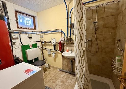 Im Hobbyraum gibt es einen neuwertigen Holzherd, mit dem man den Raum heizen und auf dem man bei Stromausfall auch kochen kann.