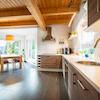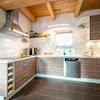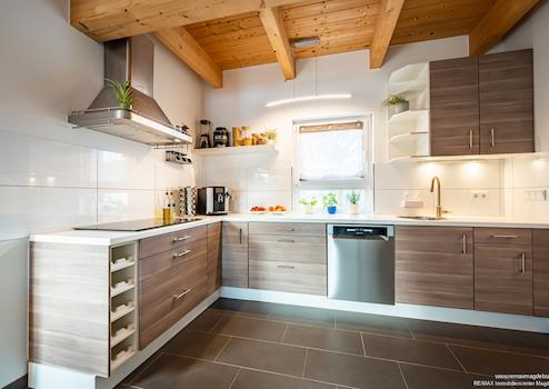 Im Erdgeschoss empfängt Sie ein heller, freundlicher Flur, von dem aus alle Räume bequem erreichbar sind. Der offen gestaltete Koch- und Essbereich geht fließend in den Wohnbereich mit Kamin über und bildet das Herzstück des Hauses. Große Fensterfronten durchfluten den Raum mit Tageslicht und schaffen ein freundliches Ambiente. Die gemütliche Holzdecke mit sichtbaren Holzbalken verleiht dem Wohnbereich einen besonders warmen, einladenden Charakter und sorgt für ein behagliches Wohnflair. An kühleren Tagen lädt der Kamin zu entspannten Stunden in wohnlicher Atmosphäre ein.