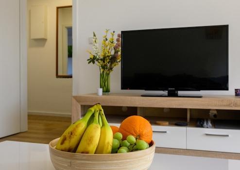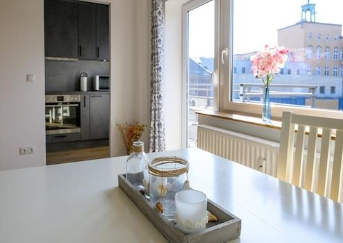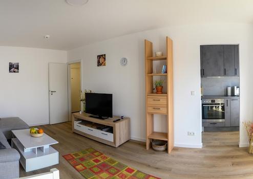 In der neuwertigen Küche mit edler Farbgebung befindet sich neben einem Geschirrspüler und einem Backofen mit Elektroherd außerdem ein Kühlschrank, eine Edelstahl-Spüle, eine Kaffeemaschine, ein Toaster sowie moderne Hängeschränke, die zusätzlichen Stauraum bieten. Das großzügige und helle Wohnzimmer sorgt durch den hohen Lichteinfall über die großen Fenster für eine besonders freundliche Atmosphäre und wird mit dem Zugang zum Balkon mit Westausrichtung und Blick ins Grüne abgerundet.