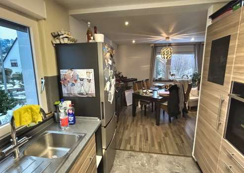 Das Erdgeschoss verfügt über einen Flur, ein großzügiges Wohn- und Esszimmer mit offener Küche und einem Gäste-WC. Über den Hauswirtschaftsraum erreicht man den großen Balkon mit Südausrichtung und Blick auf den Teutoburger Wald der über eine großzügige, elektrische Markise aus dem Jahr 2023 verfügt. Zudem besteht ein direkter Zugang zum Keller.
