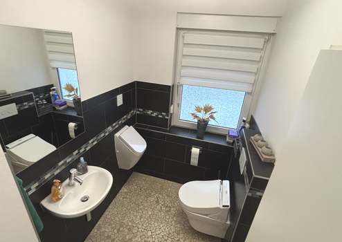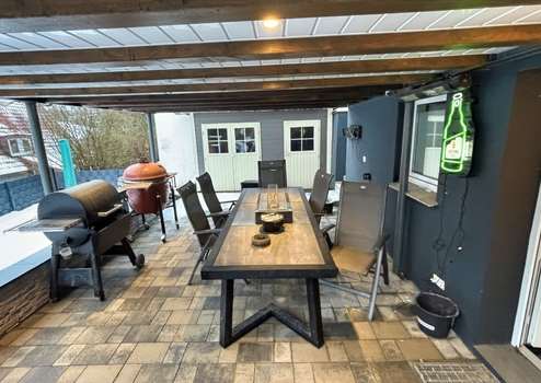 Durch die Hanglage ist das Kellergeschoss nach hinten ebenerdig und bietet direkten Zugang zur großen, überdachten Terrasse sowie zum Garten mit Gartenhaus. Der Keller umfasst ein Gäste-WC, einen Werkraum, einen Wäscheraum mit Podest für Waschmaschine und Trockner sowie einen weiteren Abstellraum.