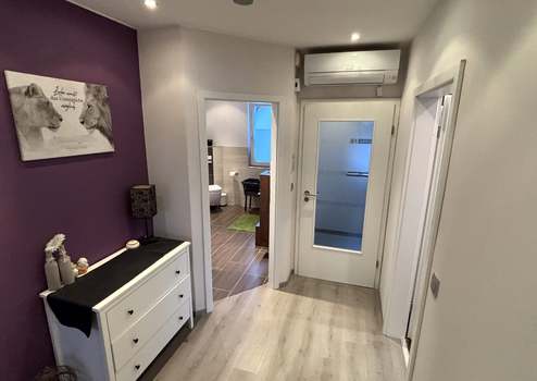 Im Obergeschoss befinden sich ein Flur, ein Büro, ein Kinderzimmer sowie ein Schlafzimmer mit Zugang zum begehbaren Kleiderschrank. Das Badezimmer ist mit Dusche und Badewanne ausgestattet. Im Flur ist eine Klimaanlage vorhanden, die das gesamte Obergeschoss in den warmen Sommermonaten kühlt.