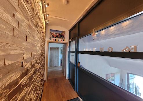 Im Wohnbereich wurde Claytec-Designputz mit Aluminiumzuschlag verarbeitet, im hinteren zweiten Flur Claytec mit Strohzuschlag. Die Türen sind mit eleganten Design-Lisenen versehen. In den Bereichen der entfernten Wände wurde das Parkett vom Schreiner fachgerecht ergänzt und angepasst.