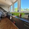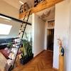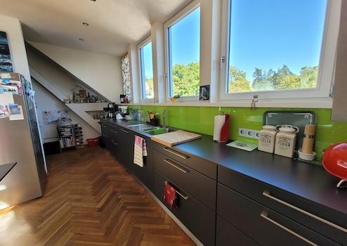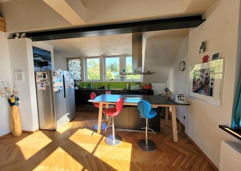 Der offen bis unter das Dach geführte Wohn-Ess-Küchenbereich bildet das Herzstück der Wohnung. Eine integrierte Bücherempore, erreichbar über eine Leiter, verleiht dem Raum zusätzliche Großzügigkeit und Aufenthaltsqualität. Die im Kaufpreis enthaltene Einbauküche (Next125 von Schüller) fügt sich harmonisch in das Gesamtbild ein. Sämtliche Velux-Dachfenster sind elektrisch betrieben (Solarmodul) und im Wohnbereich zusätzlich mit einer Beschattungsanlage ausgestattet.