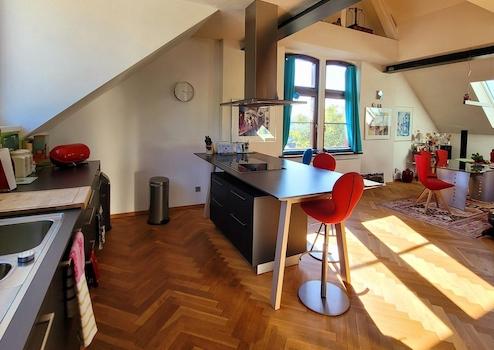 Die repräsentative Dachgeschoss-Wohnung verbindet historischen Charme mit zeitgemäßem Wohnkomfort: In einem denkmalgeschützten Gebäude aus dem Jahr 1888 (ehemalige Elementarschule, später Katasteramt) entstand im Rahmen einer umfassenden Kernsanierung 2013/2014 eine hochwertige Architektenwohnung mit loftartigem Charakter und beeindruckender Raumwirkung.