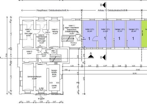 Im oberirdischen Keller im Anbau befinden sich zwei geflieste Kellerräume mit Tageslichtfenstern. Die angrenzende Waschküche bietet Platz für Waschmaschine und Trockner. Zusätzlich stehen im Altbau ein ehemaliger Sozialraum sowie eine Küche zur gemeinschaftlichen Nutzung zur Verfügung, ergänzt durch einen kühlen Getränkekeller.