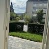 Vom Wohnzimmer aus gelangt man auf eine kleine Terrasse mit Garten. Eingezäunt und mit einer Markise versehen.