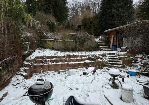 Dieses Gebäude wurde ursprünglich als Einfamilienhaus errichtet und später zu einem Zweifamilienhaus umgebaut. Das Dachgeschoss ist ausgebaut, sodass eine der Wohneinheiten über zwei Etagen genutzt wird. Die Heizungsanlage wurde im Obergeschoss bereits 2016 auf eine Gasbrennwerttechnik umgestellt, im Untergeschoss erfolgte die Erneuerung der Heizungsanlage im Jahr 2024. Im Bereich des Erdgeschosses wurde eine frühere Feuchtigkeitsproblematik an der hangseitigen Rückwand durch Sanierungsmaßnahmen im Innen- und Außenbereich dauerhaft behoben. Zur Ableitung von anfallendem Wasser auf der hangseitigen Terrasse ist ein automatisches Pumpensystem installiert, welche das Wasser kontrolliert in den Kanal leitet.