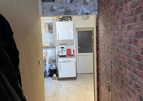 Geradeaus entlang des Flures gelangt man in den Küchenbereich, der mit einer Einbauküche ausgestattet ist. Von hier aus besteht ein direkter Zugang zur Terasse. Am Ende der Küche befindet sich auf der rechten Seite das Badezimmer mit Dusche, Waschbecken, WC sowie einem Anschluss für die Waschmaschine.
