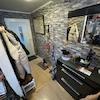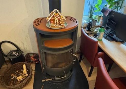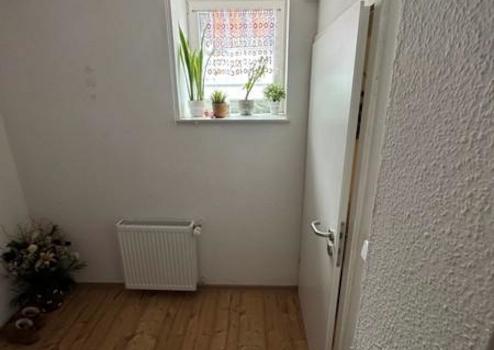 Geradeaus erreicht man den Wohnbereich, der mit einem Kaminofen ausgestattet ist. Von dort aus führt links ein kleiner Flur, über den das Badezimmer zugänglich ist. Das Badezimmer ist mit einer Duschwanne, einem Waschbecken und einem WC ausgestattet. Direkt daneben befindet sich ein Abstellraum mit zusätzlicher Toilette, Waschbecken sowie einem Waschmaschinenanschluss.