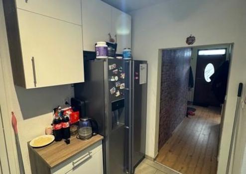 Beim Betreten der Wohnung im Obergeschoss gelangt man in den Flur, von dem aus sich der Wohnbereich erschließt. Angrenzend befindet sich die Küche, die mit einer Einbauküche ausgestattet ist.