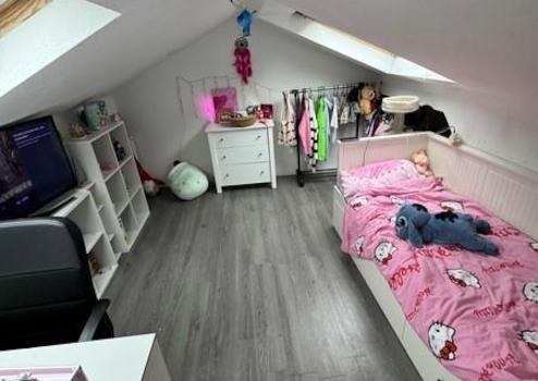 Ebenfalls über diesen Flur gelangt man in das Schlafzimmer. Eine Holztreppe im Flurbereich führt in das ausgebaute Dachgeschoss, in dem sich zwei weitere Zimmer befinden, die sich Kinderzimmer eignen.