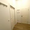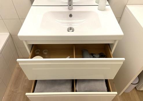 The apartment is fully equipped with a fitted kitchen and all necessary utensils such as glasses, cutlery, pots, pans, etc., a newly furnished bathroom including a washing machine, a bathtub with shower, and new bath towels, a living area with a new sofa, smart TV, and Wi-Fi, a furnished dining area, a large bedroom with a new double bed, wardrobe, fresh bedding, and a home office workspace, a small hallway with coat rack and shoe cabinet, and a storage room with vacuum cleaner, mop, bucket, iron, ironing board, clothes drying rack, and ladder.