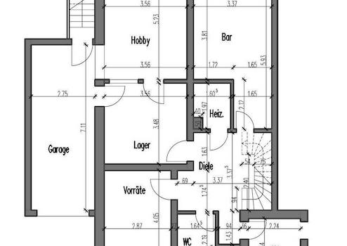 Lange Garage in Massivbauweise mit Hauszugang und Betontreppe in den Garten. Waschküche und Keller mit Betonboden und div. Abflüssen, Wasseranschlüssen und einem Gasanschluss für einen Gasherd in der Waschküche. Separater Heizungsraum, rustikale Kellerbar mit Abluft durch abgehängte Decke. Schattig gelegener beheizter Hobbyraum. Badezimmer mit Dusche und Fenster. Großer Flur mit Steintreppe ins EG und Zugang zum Hausanschlussraum.