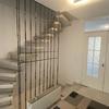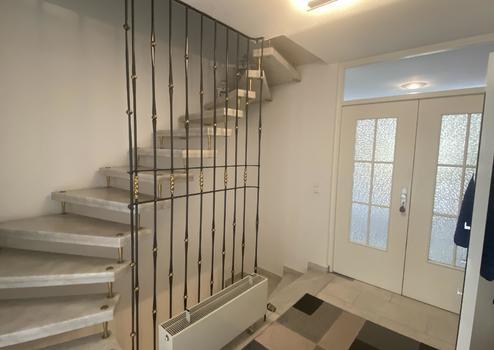 Das zentrale Treppenhaus mit Gäste-WC öffnet sich in das lichtdurchflutete Wohnzimmer mit offener Küche und Essbereich. Große Fenster schaffen eine helle und freundliche Wohnatmosphäre.