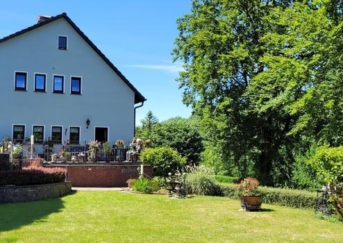 Der idyllische Garten erstreckt sich über mehrere Ebenen, wodurch die unterschiedlichsten Ruhe-/Aktivitätszonen entstehen. Die großzügige Einfahrt zum Hof bietet genügend Raum für mehrere Fahrzeuge, die eigene Garage rundet das Platzangebot ab.
