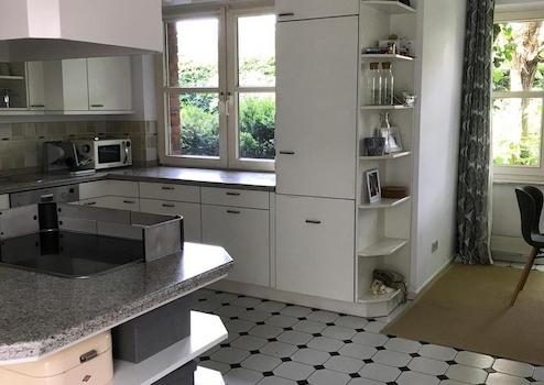 Das 1989 fertiggestellte Objekt liegt am Ende einer wenig befahrenen Sackgasse und wurde von einem örtlichen Bauunternehmer grundsolide, mit hochwertigen Materialien und großzügigen Raumaufteilungen für seine Familie gebaut. 1999/2000 ist das Haus mit Geschmack, Geschick und liebevollen Details zu einem Dreiparteienhaus umgebaut worden.