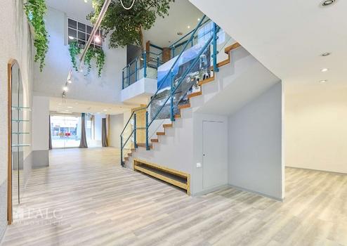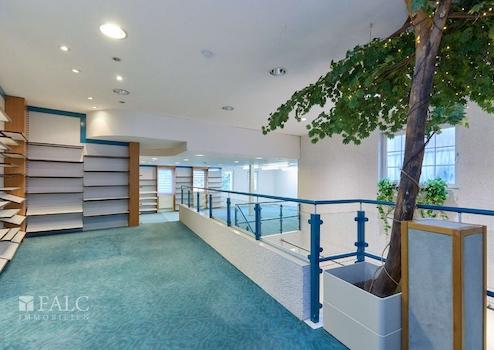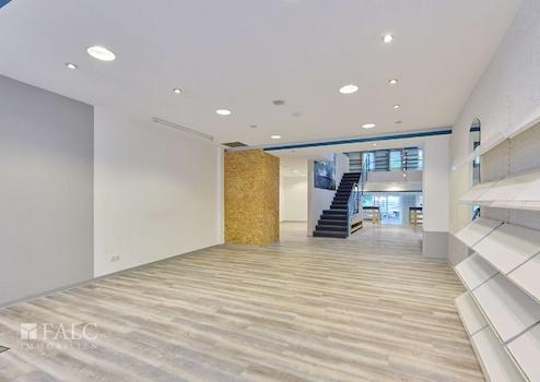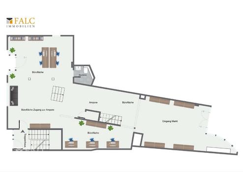 Die rund 270 m² große Gewerbefläche verteilt sich auf zwei Etagen und ist über zwei separate Eingänge zugänglich – einer davon direkt vom Marktplatz, der andere von der Schleidanusstraße mit direkter Anbindung an den öffentlichen Parkplatz.