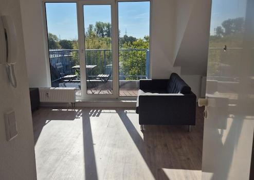 Die großzügige Fensterfront und das zusätzliche Dachfenster durchfluten die Wohnräume mit viel Licht. An den Wohnbereich grenzt außerdem ein eigener Balkon mit schönem Ausblick.