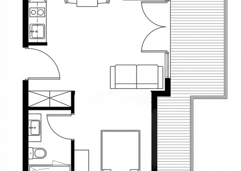 Der Wohnungsschnitt ermöglicht separate Zonen, sodass der Schlaf- vom Wohnbereich getrennt ist und ebenso ein separater Koch- und Essbereich besteht.