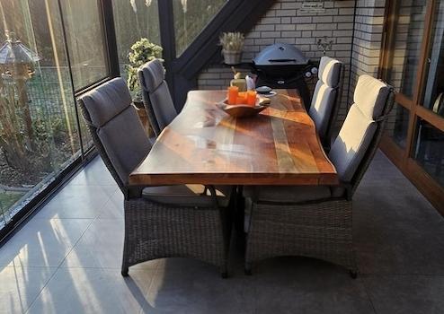 Vom Flur aus betritt man auch den gut geschnittenen Wohnraum. Wie im gesamten Erdgeschoss ist auch der Wohnraum mit Fußbodenheizung ausgestattet und 2022 neu gefliest, die bodentiefen Fenster lassen über zwei Seiten viel Licht hinein. Der Wohnraum bietet viel Platz für einen großzügigen Esstisch als auch für eine Wohnlandschaft. Für winterliche Gemütlichkeit und angenehme Wärme sorgt der schöne Kaminofen. Im Sommer hingegen erfreut sich die geflieste Terrasse mit dem in 2025 errichtetem Wintergarten über einen Besuch. Bei zu viel Sonnenschein spendet die neue verbaute elektrische Funkmarkise erholsamen Schatten.