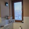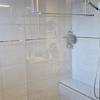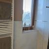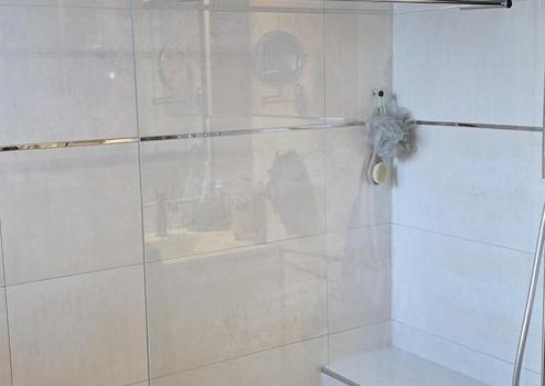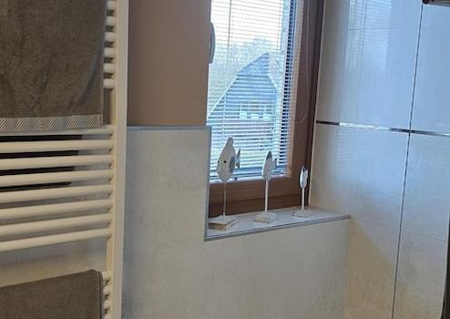 Das Gäste-WC und das Duschbad wurden 2023 in Naturtönen gefliest und mit weißen Sanitärobjekten ausgestattet. Ein Fenster sorgt für Helligkeit.