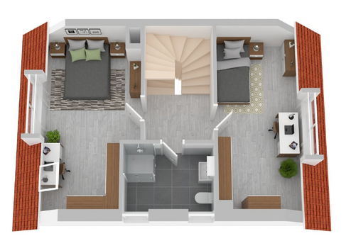 Vom Wohnraum aus führt die offene Treppe mit Echtholzstufen in die anderen Geschosse. Im Dachgeschoss sind zwei Schlafräume und das Duschbad untergebracht. Das Bad ist ebenfalls über zwei Fenster(2025 erneuert) sehr gut belichtet, die Ausstattung ist modern gestaltet. Handtuchheizkörper, Doppelwaschtisch mit Unterschrank, Walk-in-Dusche mit Sitzbank und Regen-Duschkopf bieten Komfort und Bewegungsfreiheit. Das Duschbad ist gefliest, die Fußböden in den anderen Räumen im Dachgeschoss sind mit Parkett ausgestattet. Im zweiten Dachgeschoss findet sich ein weiteres ausgebautes Zimmer mit großem Giebelfenster( 2025 erneuert) und ebenfalls Parkettboden.
