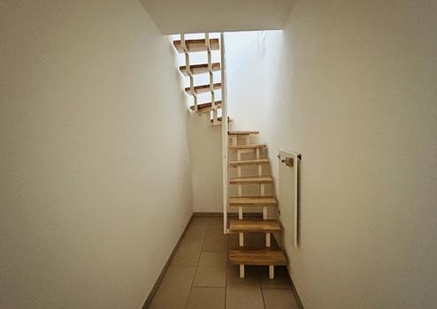 Im unteren Geschoss stehen zwei Zimmer zur Verfügung, von denen eines Zugang zu einem Balkon bietet, der einen schönen Blick in den ruhigen Innenhof eröffnet. Ebenfalls auf dieser Etage befinden sich die helle Küche sowie eines der beiden Bäder. Die Küche ist bereits im Kaufpreis inbegriffen, ebenso wie die auf dem Balkon installierte Markise, die für angenehmen Schatten an sonnigen Tagen sorgt.