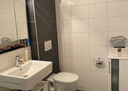Ein modernes Badezimmer mit Dusche und Badewanne, ein separates Gäste-WC sowie ein praktischer Abstellraum runden das Raumangebot ab. Die vorhandene Einbauküche kann übernommen werden, ebenso auf Wunsch weitere Einrichtungsgegenstände.