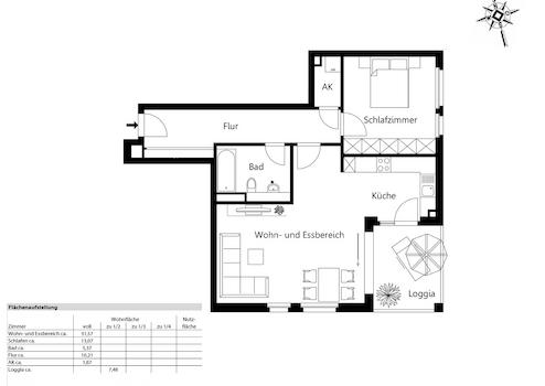 Die Wohnung selbst bietet mit ihren hohen Decken (2,70 Meter) und den großen Fenstern eine lichtdurchflutete Atmosphäre. Besonders hervorzuheben ist die Loggia, die nach Süden ausgerichtet ist. Die großen Fenster sorgen nicht nur für eine hervorragende Belichtung der Räume, sondern vermitteln auch ein großzügiges Raumgefühl.