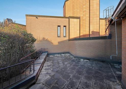 Ein weiteres Highlight ist die eine weitere Ebene höher liegende Sonnenterrasse. Uneinsichtig und mit Blick in den Park.