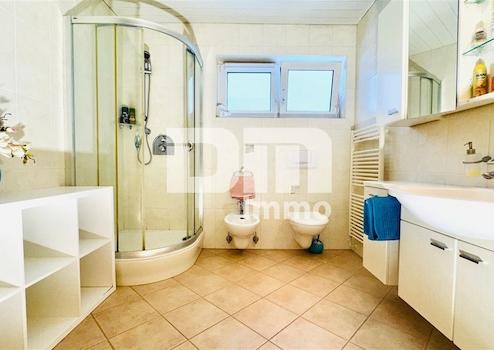 Das Tageslichtbad überzeugt in zeitlosem Fliesendesign und verfügt über eine Dusche, Bidet sowie Handtuchwärmer.
