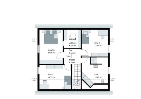 Durch die 1,5-geschossige Bauweise mit individuell planbarem Kniestock entsteht im Obergeschoss ein voll nutzbarer Lebensbereich. Kinderzimmer mit Platz zum Wachsen. Ein ruhiges Schlafzimmer. Vielleicht ein kleines Büro oder Gästezimmer. Viel Stellfläche trotz Kniestock.