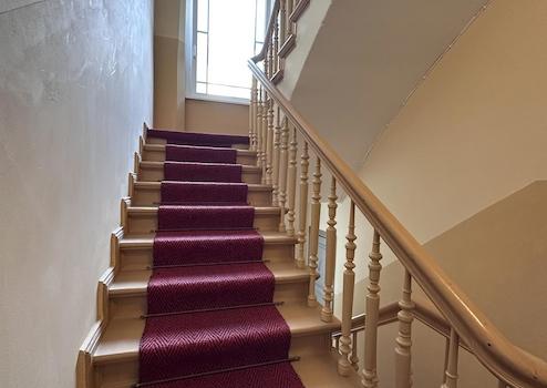 Die gefliesten Bäder sind lang und schmal. Im Grundriss als ein Tageslichtbad. Highlight der Eigentumswohnung sind die typischen Altbauelemente, wie Kassettentüren, Stuck, Stuckrosetten, Flügeltüren, Fischgrätparkett und Dielen. Aktuell ist der Auftrag erteilt worden, einen Schindler-Fahrstuhl anzubauen. Dieser wird schätzungsweise gegen Ende 2025/2026 Frühjahr fertiggestellt. Das Treppenhaus im Vorderhaus wird voraussichtlich nach der Fertigstellung des Fahrstuhls fertiggestellt. Es handelt sich beim Wohnzimmer um ein maßstabsgetreues Foto, das mit KI bearbeitet wurde. So oder ähnlich könnte der Raum nach erfolgter Renovierung und mit neuer Ausstattung aussehen.