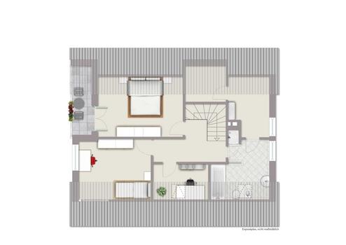 Das großzügige Wohn- und Esszimmer bietet viel Platz. Im Dachgeschoss wurde das Badezimmer im Jahr 1991 modernisiert und präsentiert sich in einem gepflegten Zustand. Das Gäste-WC wurde 2008 ebenfalls modernisiert und zusätzlich wurde in die Küche mit einer neuen Einbauküche ausgestattet.