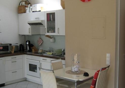 Die Einbauküche ist mit Kühlschrank, Ceranfeld-Herd und Backofen ausgestattet.