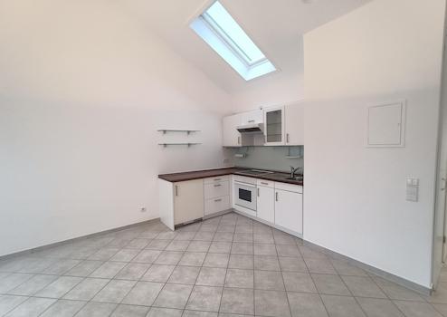 Sonniges und gemütliches Studio mit Dachgeschoss-Flair für Singles. Die hohen Decken und Südfenster machen den Wohn-Essraum zu einem lichtdurchfluteten Wohlfühlraum.